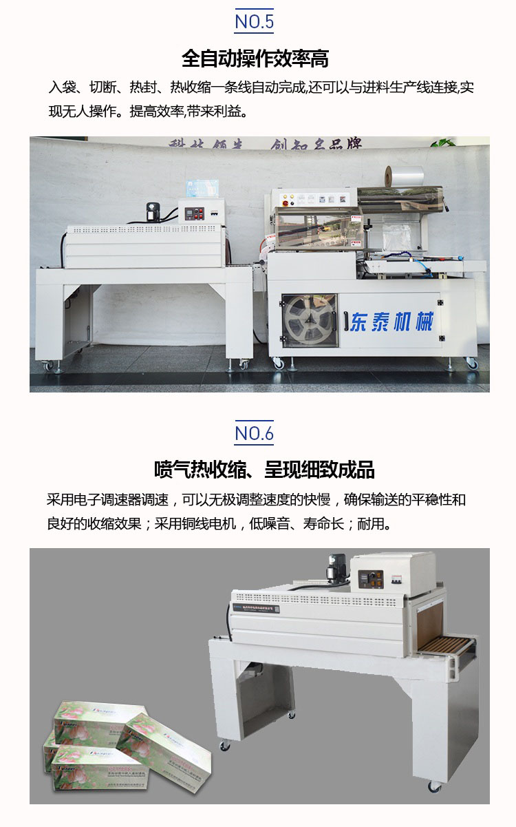 自動塑料膜熱收縮包裝機結構緊湊占地面積小,非常適合配套自動包裝流水線完成產品的自動無人化包裝,適合于單個物品包裝或有底托物品包裝。自動送膜打孔裝置和手動調節的導膜系統以及手動調節的進料輸送平臺,可適于不同寬度和高度的產品,實現一臺機器滿足各種尺寸的包裝物品。