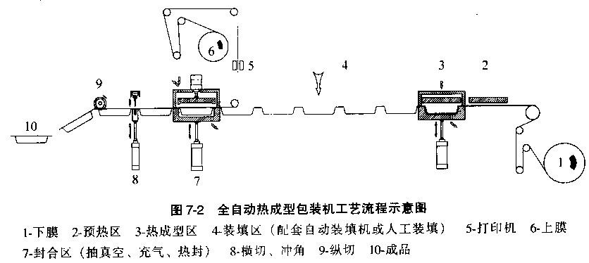 包裝的全過(guò)稅由機(jī)器自動(dòng)完成,根據(jù)需要,裝填可采用人工或機(jī)械實(shí)現(xiàn)。內(nèi)流程圖可見(jiàn),下卷膜經(jīng)牽引以定步距步進(jìn),經(jīng)預(yù)熱區(qū)及加熱區(qū),由氣壓、真空或沖模成型,在裝填區(qū)填充物料后進(jìn)入熱封區(qū)。在熱封區(qū)中,上卷膜經(jīng)導(dǎo)輥后覆蓋在成型盒上,視包裝需要可進(jìn)行抽真空或充入保護(hù)氣體的處理,然后進(jìn)行熱壓封合。后經(jīng)橫切、縱切及切角修邊形成一個(gè)個(gè)美觀(guān)的包裝成品。至于經(jīng)裁切后的邊料可由抽吸捅或卷?yè)P(yáng)裝置收集和清理。